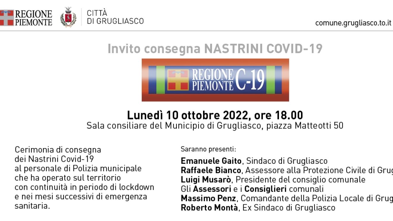 Lunedì 10 ottobre, alle 18, presso la sala consiliare del municipio di Grugliasco, in piazza Matteotti 50. si è svolta la cerimonia di consegna dei nastrini Covid-19, realizzati dalla Regione Piemonte, al personale di Polizia municipale che ha operato sul territorio con continuità in periodo di lockdown e nei mesi successivi di emergenza sanitaria.