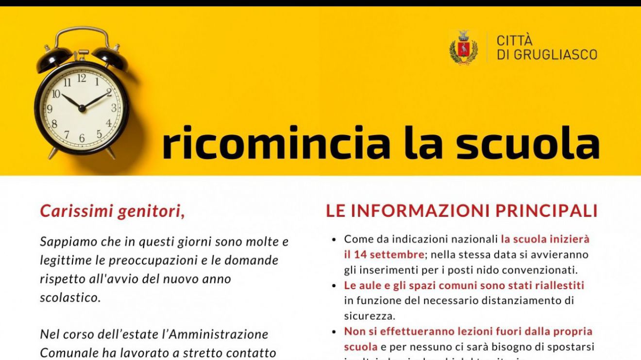 Il comune di Grugliasco ha preparato una info scheda allegata con le informazioni principali dedicate ai genitori per sapersi orientare prima dell'inizio della scuola.