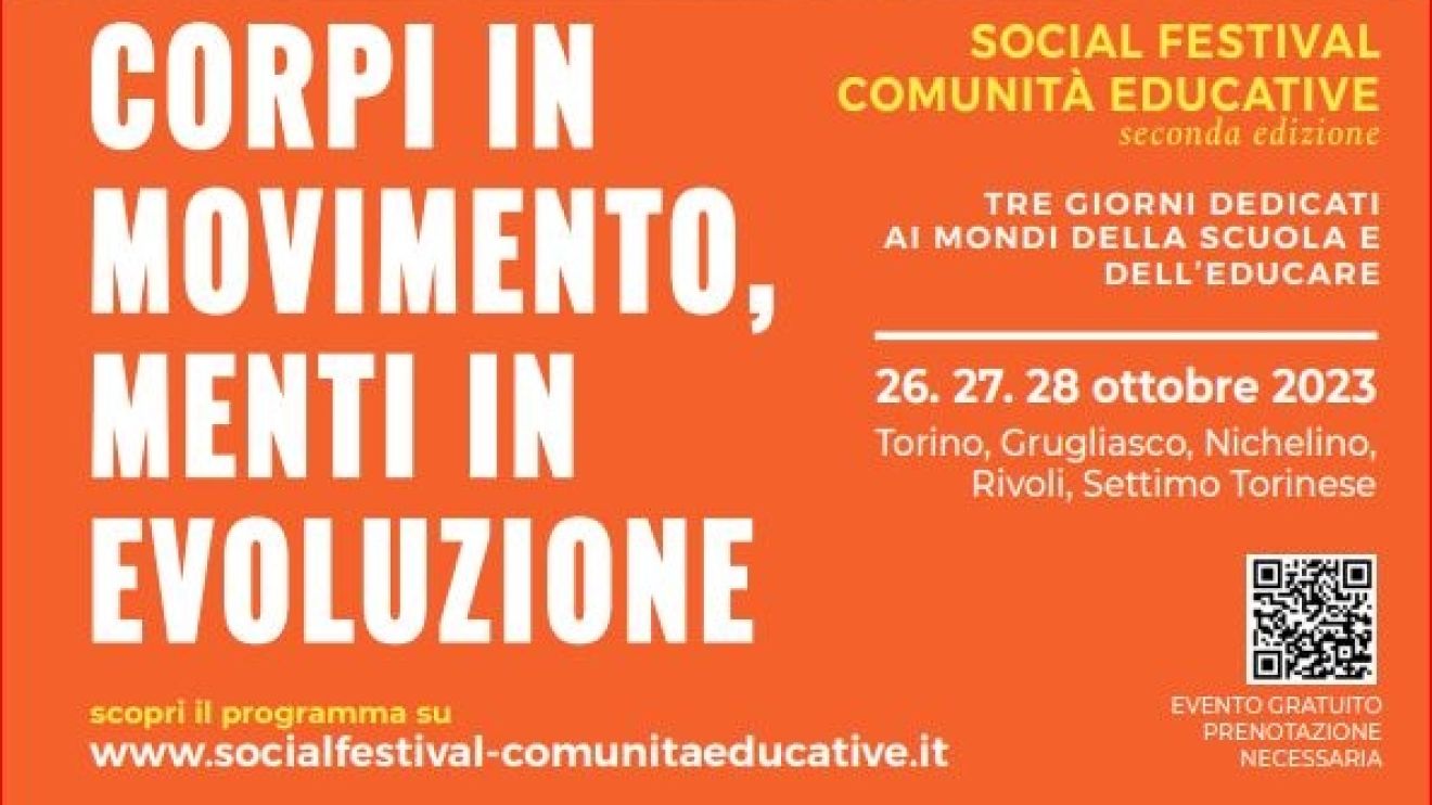 Da qui nasce l'idea della seconda edizione del Social Festival Comunità educante “Corpi in movimento, menti in evoluzione”, programmato dal 26 al 28 ottobre tra Torino, Grugliasco, Nichelino, Rivoli e Settimo Torinese. Tre giorni dedicati ai mondi della scuola e dell'educare, promossi dal comune di Torino, Città Metropolitana di Torino con la direzione scientifica di Animazione Sociale e il sostegno di Fondazione Compagnia di San Paolo a cui aderisce anche la città di Grugliasco.