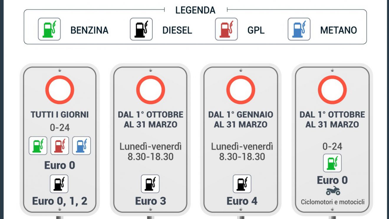 - ciclomotori e motocicli a benzina Euro 0: dal 1° ottobre al 31 marzo, tutti i giorni, festivi compresi, dalle 0 alle 24.