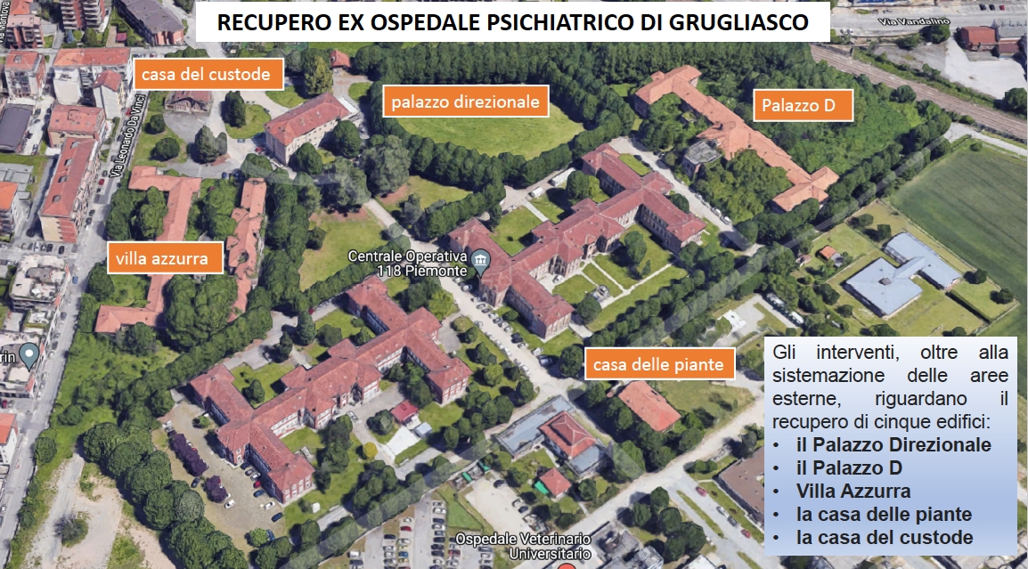 Gli interventi di rifunzionalizzazione e restauro dell'ex ospedale psichiatrico di Grugliasco, oltre alla sistemazione delle aree esterne con 60 mila metri quadri di aree verdi, prevedono il recupero di 10 mila metri quadri, che vedrà interessati il Palazzo Direzionale, il Palazzo D, Villa Azzurra, la Casa delle Piante e la Casa del custode. Un progetto del valore di 24.134.506 Euro, di cui 4.659.597 a carico dei richiedenti che dovrà essere completato entro il 31 dicembre 2025.
