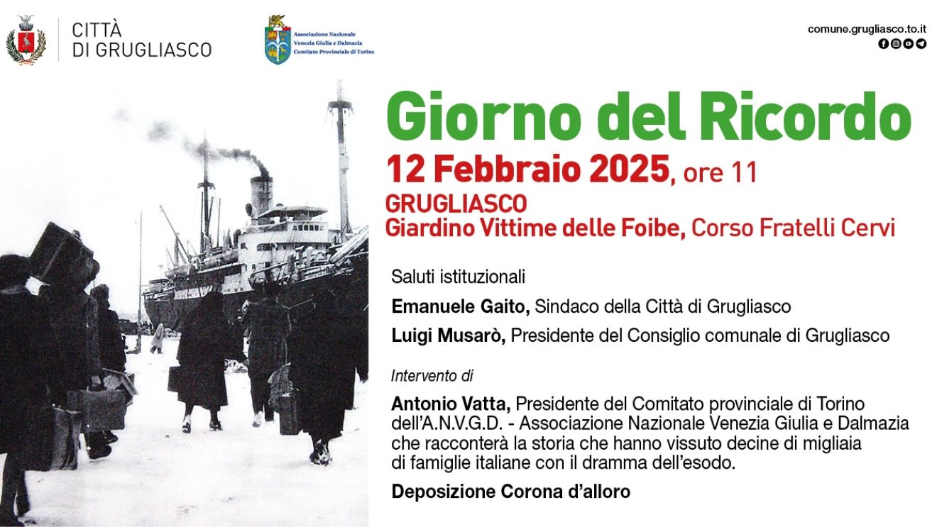 Mercoledì 12 febbraio, alle 11, al giardino Vittime delle Foibe, in corso Fratelli Cervi 57, a Grugliasco, si è svolta la ricorrenza del Giorno del Ricordo con la deposizione di una corona di fiori alla presenza del consigliere comunale Domenico Palomba in rappresentanza del Sindaco, Emanuele Gaito, del presidente del Consiglio Comunale, Luigi Musarò, di Antonio Vatta, Presidente del Comitato provinciale di Torino dell’Associazione Nazionale Venezia Giulia Dalmazia, che ha raccontato la storia che hanno vissuto decine di migliaia di famiglie italiane con il dramma dell'esodo e dei rappresentanti delle associazioni degli esuli istriani, fiumani, dalmati. Alla ricorrenza hanno partecipato anche diversi consiglieri comunali, l'associazione nazionale Alpini, l'associazione nazionale Marinai d'Italia, l'associazione Borgo San Giacomo, i Vigili del fuoco volontari di Grugliasco e il Corpo Musicale di Grugliasco con uno dei suoi trombettieri.