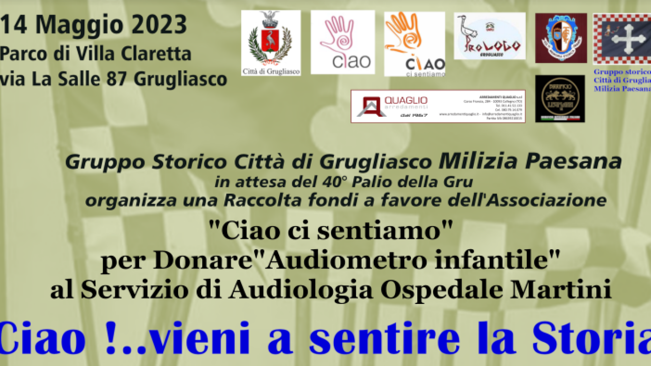 Il gruppo storico della Città di Grugliasco milizia paesana, in attesa del 40° palio della Gru ha organizzato una raccolta fondi a favore dell'associazione “Ciao ci sentiamo” per donare un audiometro infantile al servizio di audiologia dell'ospedale Martini. Il tutto durante una manifestazione dedicata alla storia della città.