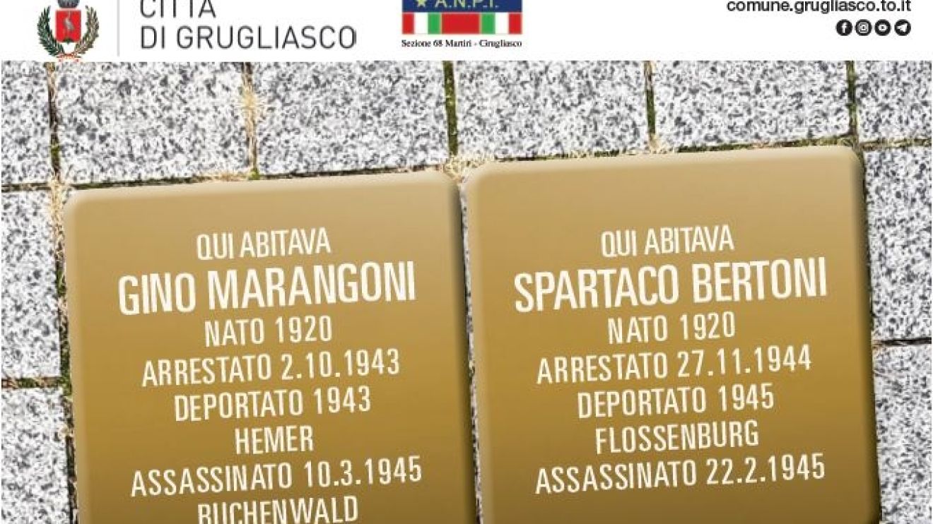 Sono state le prime due pietre d’inciampo posate a Grugliasco dedicate ad altrettante vittime della persecuzione fascista e nazista. Proprio nella giornata della memoria di lunedì 27 gennaio 2025 sono state posate le due nuove pietre, in ricordo di Gino Marangoni e Spartaco Bertoni, in viale Gramsci 62/bis e presso il parco Gino Marangoni, in via Pawa 7, a borgata Fabbrichetta, alle 10,30, dove si svolgerà la cerimonia pubblica.