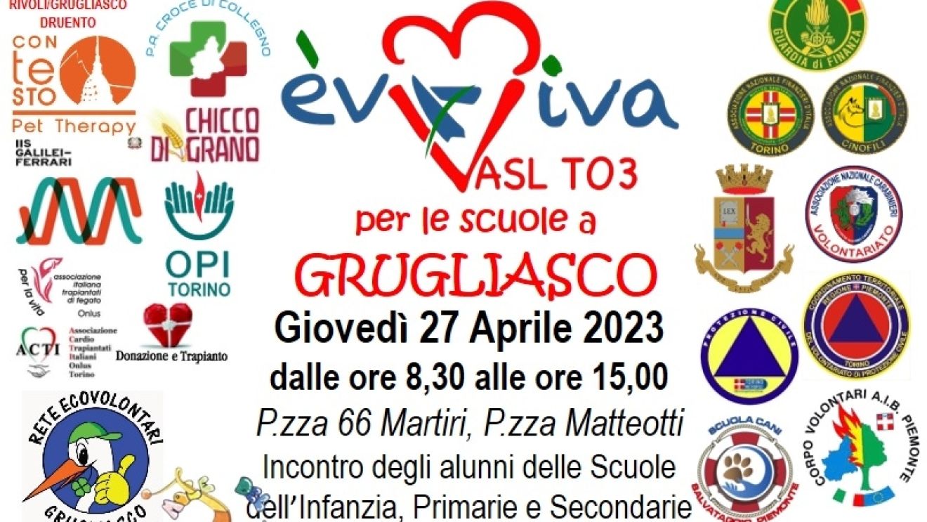 L'Asl To 3 e la Città di Grugliasco, con il patrocinio della Regione Piemonte, organizzano “Evviva per le scuole, con l'obiettivo di sensibilizzare alla rianimazione cardiopolmonare. L'appuntamento si è svolto giovedì 27 aprile dalle 8,30 alle 15 in piazza 66 Martiri e in piazza Matteotti.