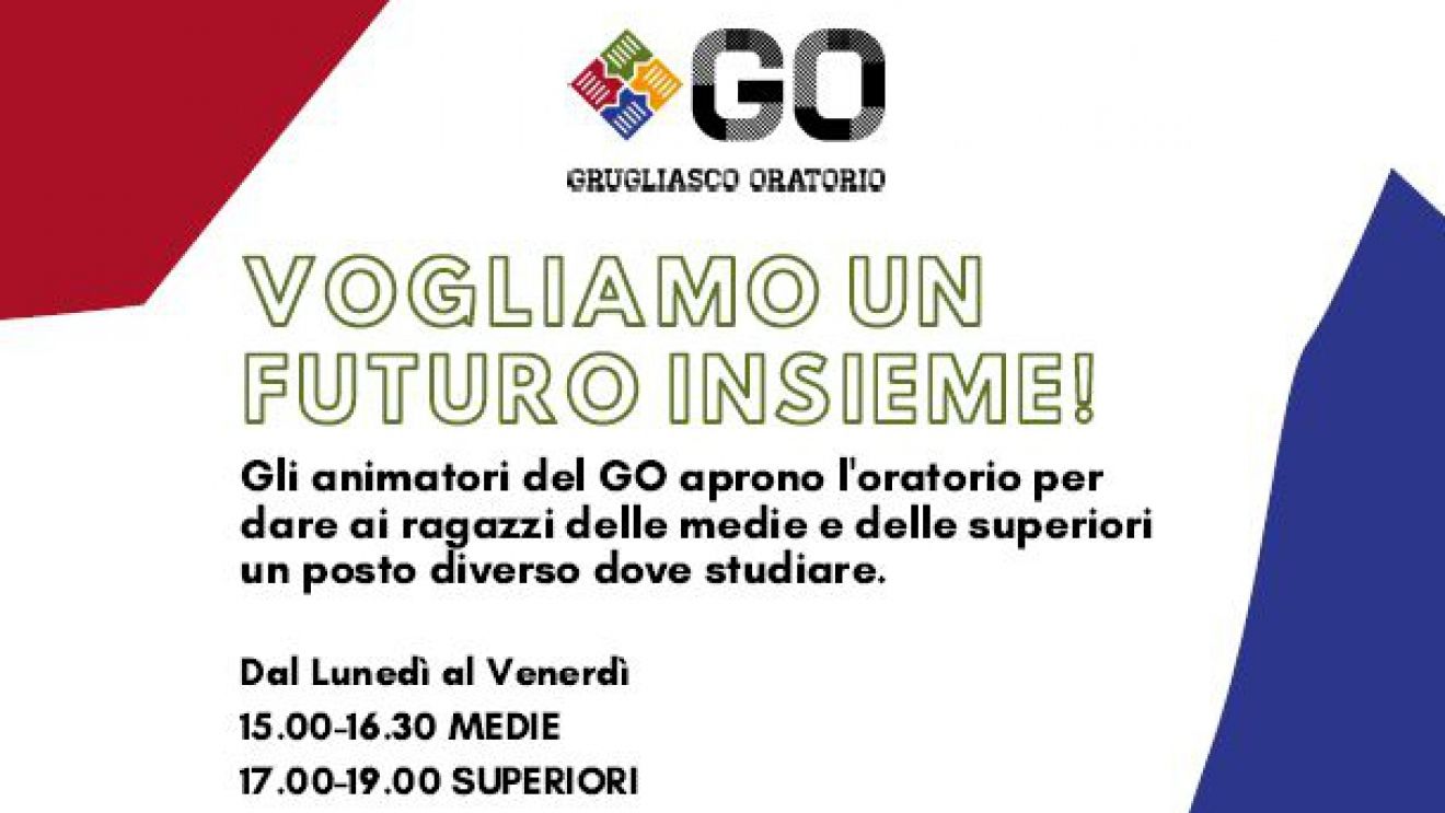 Grugliasco Oratorio (GO) è l’associazione che unisce e rappresenta le quattro realtà parrocchiali della città. Non più quattro oratori a Grugliasco, e nemmeno un oratorio unico, ma una rete che collega gli ambienti e le attività. Un coordinamento centrale, il direttivo GO, cui convergono tutte le realtà ora presenti, quali Go sport, Go musical, Go sbandieratori e musici della Torre, Go logistica, Go eventi, l’AnGOlo dei bimbi, Go segreteria, Go School… e quelle che presto verranno alla luce. Un hub centrale, dove Go ha sede: il Borgis, che diventa oratorio cittadino, ambiente di vita della pastorale giovanile.